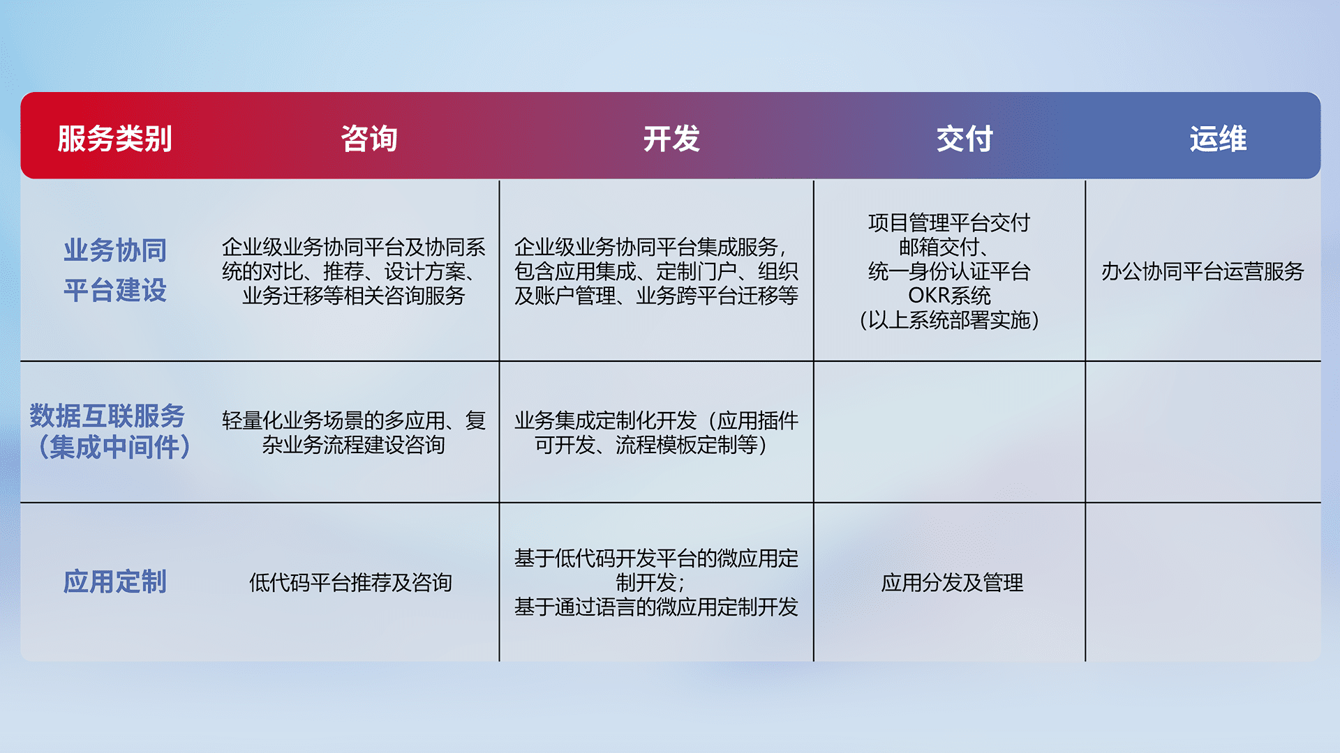 针对钉钉、、企微、、、、IDaas等平台级产品提供产品的规划、、、方案、、交付、、、定制化开发等服务,,实现如统一协同办公、、、智能客户服务、、混合会议管理、、、、智能数据查询、、等业务场景,,实现数字化转型。。。。