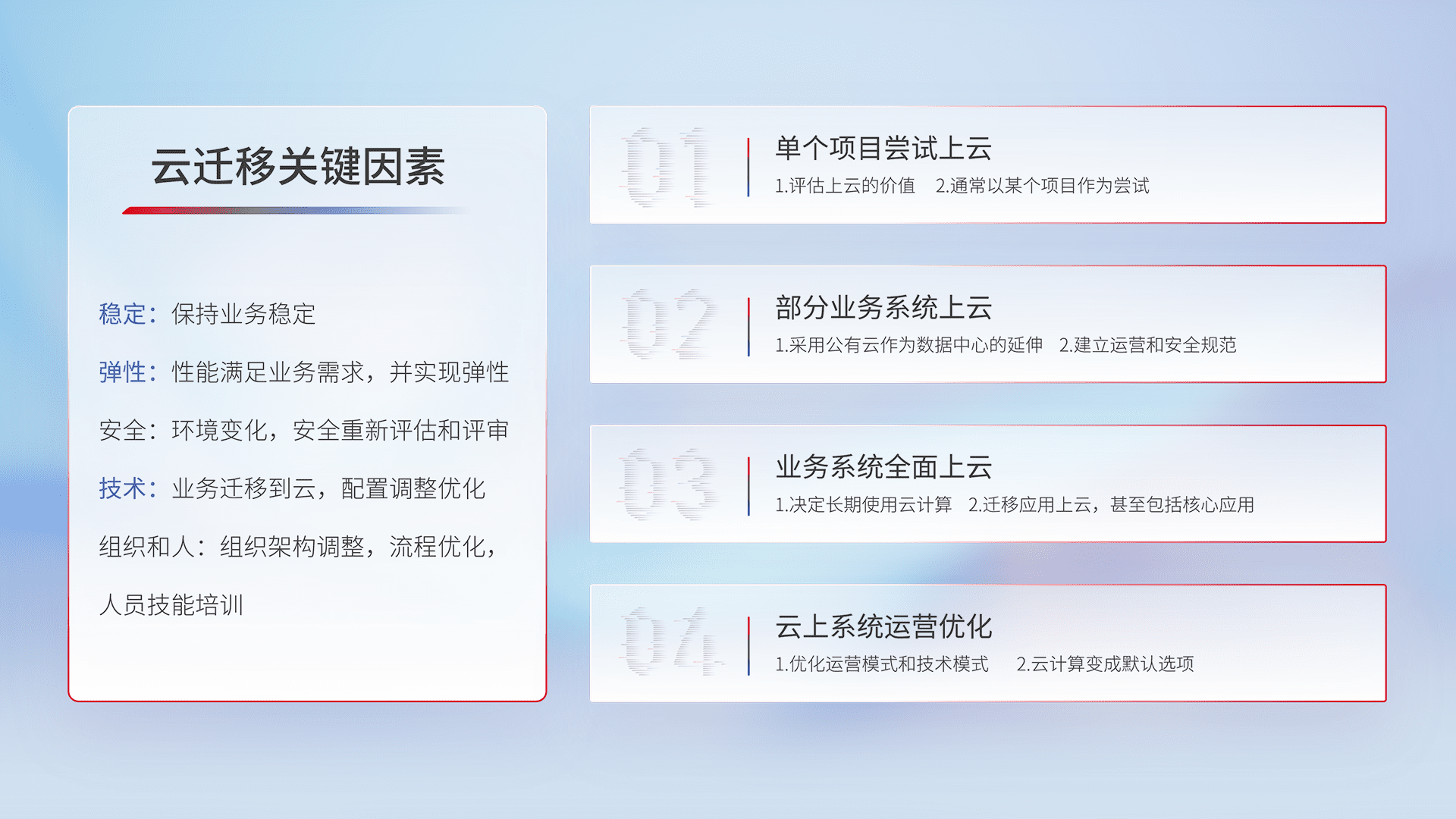 结合实际业务,,,从规划设计、、、云平台选型、、、云原生改造、、、数据迁移、、集成交付,,,,迁移全过程为客户识别最佳上云路径,,,做好风险识别管理,,,,设计网络架构、、身份权限、、安全审计合规、、、操作审计、、日志审计、、监控告警策略、、、、多站点容灾设计等,,,,对云上基础设施进行整体规划,,提升IT治理水平,,,,以满足弹性、、、高可用、、、高性能的需求。。。
