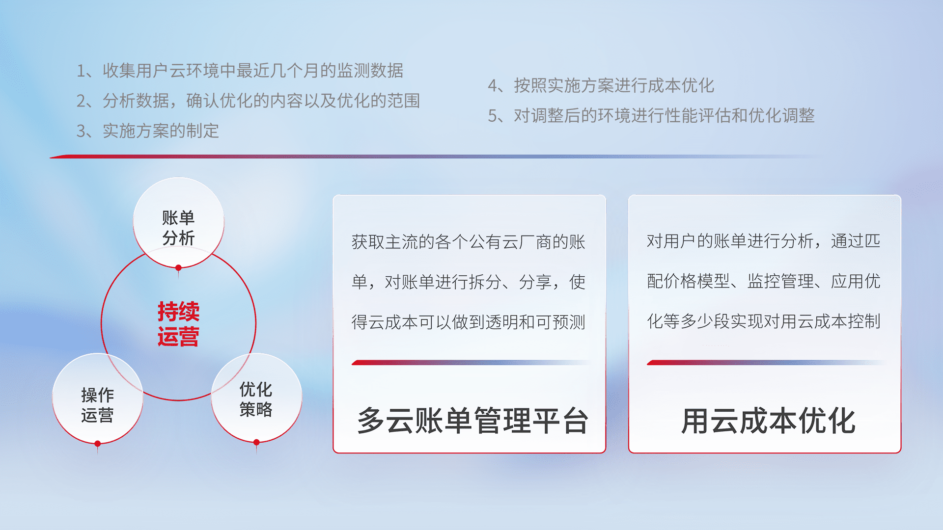 通过多云纳管,,,以统一的资源数据模型把客户的云资源进行抽象和封装,,,进而实现对多云资源的统一操作,,,,保障云资源管理的可靠性、、稳定性与可用性。。。。量身定制化运维内容,,,,配置、、、、开发运维、、、、补丁管理、、、、备份、、监控、、认证和访问管理、、、审计和日常巡检等,,,,保障在用云过程中的可靠度,,稳定度以及高可用率。。。